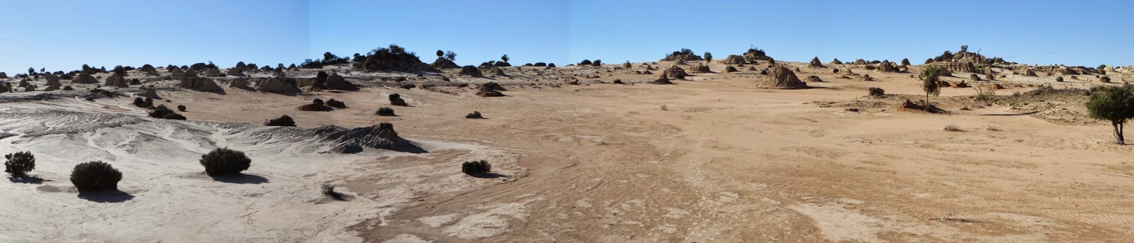 The Walls of China consist mainly of sand-dunes. After the tour, and a light lunch of sandwiches we set off on the 50 km self-drive circuit of Mungo lake, which involves three variations in landscape—Mallee scrub being the most interesting.
